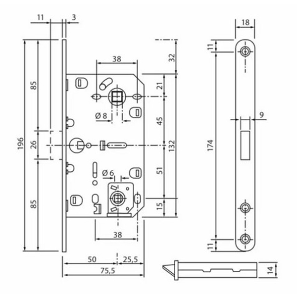 Механизм замка MOTTURA 52.771DM2856 (BS66*85мм) ключ 60мм
