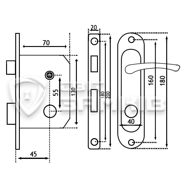 Замок врезной (9645) с ручкой BRUNO (55910). Устанавливается на входные и межкомнатные деревянные двери. Замок изготовлен из стали, что обеспечивает надежность и устойчивость к коррозии. Имеет язычок, который управляется нажатием на ручку, а также один прямоугольный ригель, который управляется с помощью сердцевины. В комплекте сердцевина отсутствует, ее нужно подобрать отдельно в зависимости от толщины дверей и необходимого уровня защиты. Дополнительно ручки на планке покрытые гальваническим покрытием.