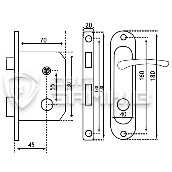 Замок врезной (9645) с ручкой BRUNO (55910). Устанавливается на входные и межкомнатные деревянные двери. Замок изготовлен из стали, что обеспечивает надежность и устойчивость к коррозии. Имеет язычок, который управляется нажатием на ручку, а также один прямоугольный ригель, который управляется с помощью сердцевины. В комплекте сердцевина отсутствует, ее нужно подобрать отдельно в зависимости от толщины дверей и необходимого уровня защиты. Дополнительно ручки на планке покрытые гальваническим покрытием.