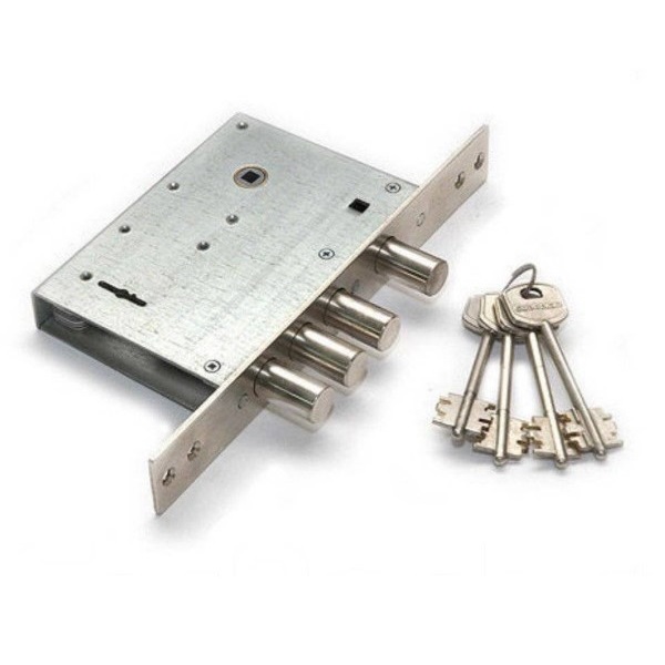 Врезной замок ГАРДИАН 30.04 это 4-х ригельный замок, который управляется сувальдным ключом и ручкой. Обычно мастера его устанавливают в качестве дополнительного замка. Нижние ригели управляются ключом, а верхний засов воротком (закрыть/открыть можно только изнутри). О его надежности говорит тот факт, что замок имеет дополнительную защиту от взлома и его сложно открыть отмычкой или "свёртышем".