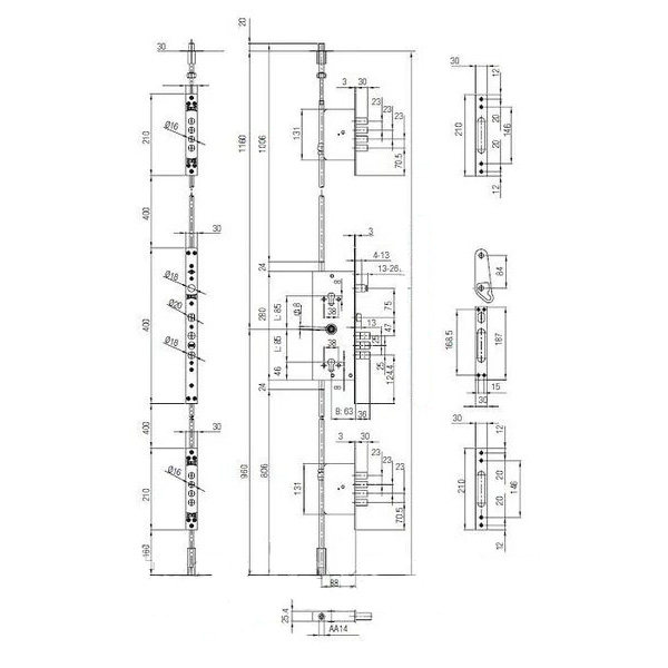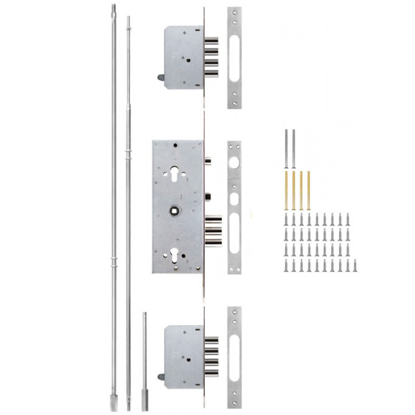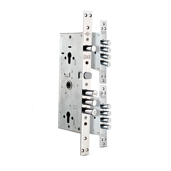 Врезной замок из серии KALE 256 - это комбинированный замок, закрывание которого осуществляется двумя сердцевинами стандарта EURO DIN. По сути представляет собой целую мультисистему усиленного многостороннего запирания с двумя запорными механизмами на стальных тягах и подходит для установки в металлические двери. Также его устанавливают в двери усиленной конструкции как основной замок вместе с взломостойкой сердцевиной и защитным протектором. Основная сердцевина (нижняя) управляет тремя ригелями диаметром 18 мм (вылет ригелей 32,5 мм) и вертикальными тягами, которые связаны с двумя девиатора. Количество ригелей в девиатора - 4. Их вылет составляет 30 мм, диаметр - 16 мм. Дополнительный ригель управляется верхним цилиндром. Таким образом, замок KALE 256 может заблокировать дверное полотно сразу на 15 точек запирания, что может значительно усложнить их вандальный злом. Подходит для правых и левых дверей. Также управление замком осуществляется ручкой, есть язычок. Ответные планки также входят в комплект.