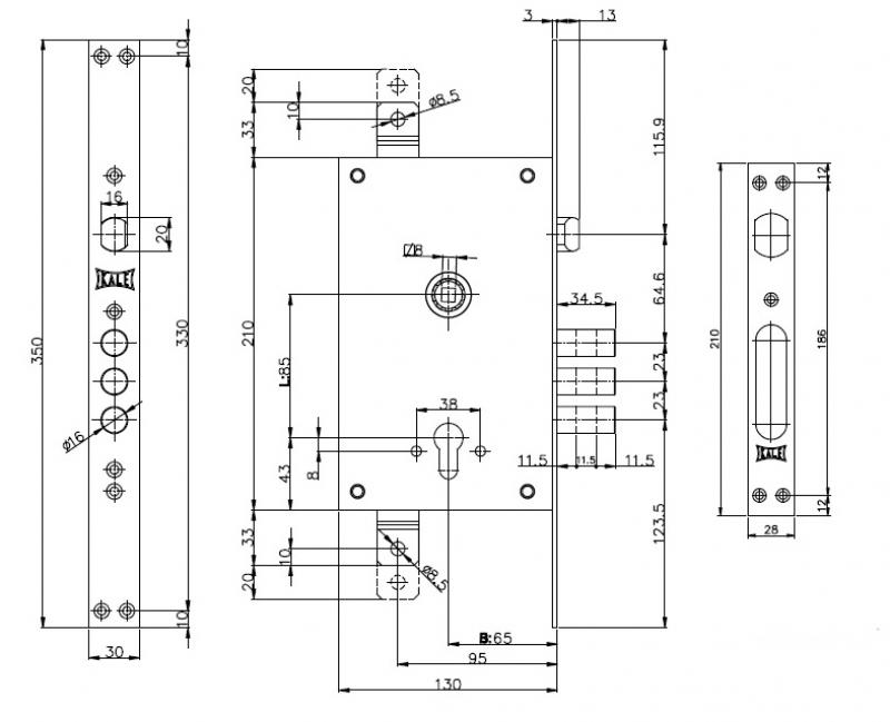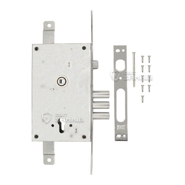 Дверная фурнитура турецкой ТМ KALE является одной из лучших по соотношению цена/качество. Данная модель - это 3-х ригельный врезной замок, который устанавливается на металлические входные двери. Подходит как для лево, так и правосторонних дверей. Управляется ручками и сердцевиной стандарта EURO DIN. Она в комплект не входит и докупается отдельно в зависимости от ваших потребностей. Особенностью этого замка является наличие проушин для крепления тяг, благодаря чему закрывание происходит в 3 стороны. Выход ригелей диаметром 16 мм составляет 34,5 мм.
