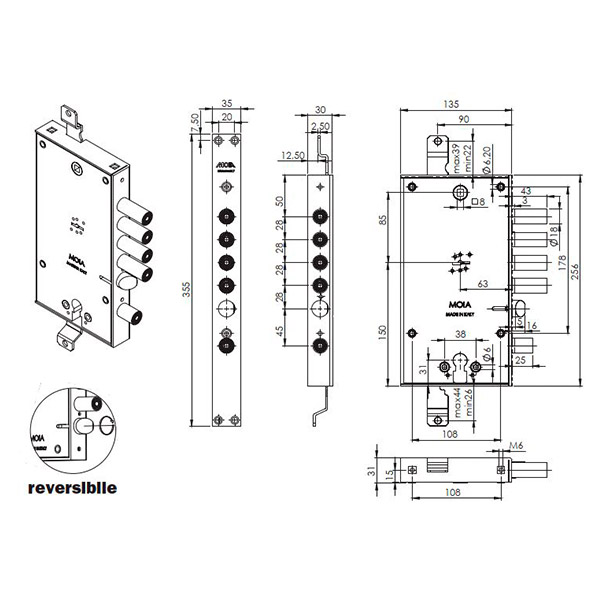 Итальянский производитель MOIA известен на рынке качеством своей дверной фурнитуры. MOIA 7154/280D/S1 – это комбинированный врезной замок, управление которым осуществляется ручками, сердцевиной стандарта EURO DIN и сувальдным ключом. Это дает возможность использовать его в качестве альтернативы установке в дверях двух отдельных замков. Верхний сувальдный механизм управляет четырьмя основными ригелями диаметром 18 мм с полным выходом 43 мм и тягами. Происходит это плавно и бесшумно. 2 дополнительных ригеля закрываются нижним цилиндром. Подходит для правой и левой двери. Есть язычок. Особенностью этого замка является наличие проушин для крепления тяг, которые в комплект не входят. Сердцевина также докупается отдельно в зависимости от ваших потребностей.