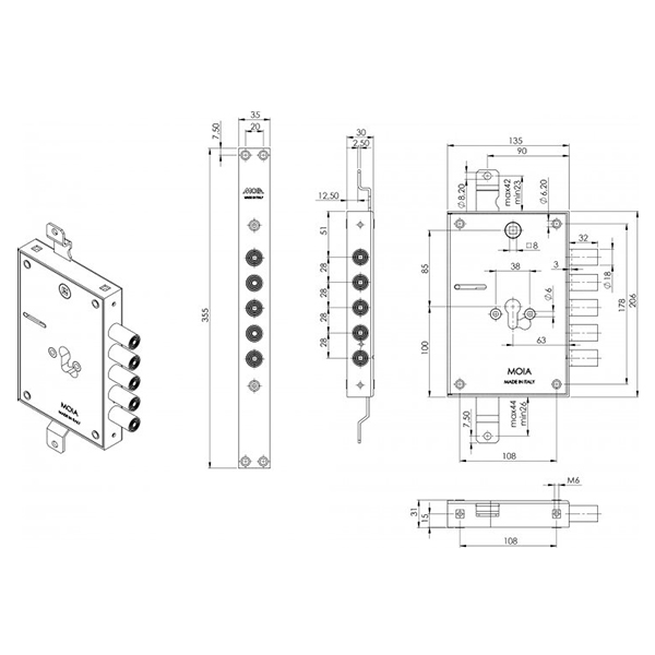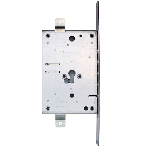 Итальянский производитель MOIA известен на рынке качеством своей дверной фурнитуры. MOIA 763/280DFB – это врезной замок, управление которым осуществляется сердцевиной стандарта EURO DIN. В основе редукторный механизм, в котором используется система из 5 зубчатых колес. Благодаря этому замок имеет длительный срок эксплуатации. Цилиндр управляет 5 ригелями диаметром 18 мм с полным выходом 32 мм и тягами. Происходит это плавно и почти бесшумно. Подходит для правой и левой двери. Используется как дополнительный верхний замок. Для защиты при попытке перелома или выбивания цилиндра система блокирует механизм. Также в нем есть проушины для крепления тяг, которые в комплект не входят. Сердцевина также докупается отдельно в зависимости от ваших потребностей.