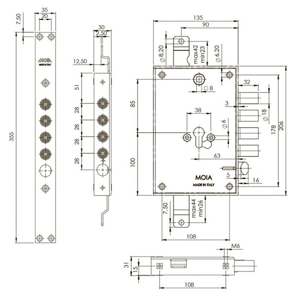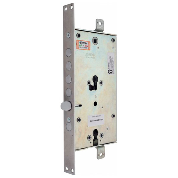 Итальянский производитель MOIA известен на рынке качеством своей дверной фурнитуры. MOIA 7654/280DFB/S1D5 – это комбинированный врезной замок, управление которым осуществляется ручками и двумя сердцевинами стандарта EURO DIN. В данной вариации они независимы друг от друга. В основе редукторный механизм, в котором используется система из 5 зубчатых колес. Благодаря этому замок имеет длительный срок эксплуатации. Верхний цилиндр закрывает 4 основных ригеля диаметром 18 мм с полным выходом 32 мм и тяги. Происходит это плавно и бесшумно. 2 дополнительных ригеля управляются нижним цилиндром. Подходит для правой и левой двери. Есть язычок. Для дополнительной защиты при попытке перелома или выбивания цилиндра система блокирует механизм. Особенностью этого замка является наличие проушин для крепления тяг, которые в комплект не входят. Сердцевина также докупается отдельно в зависимости от ваших потребностей.