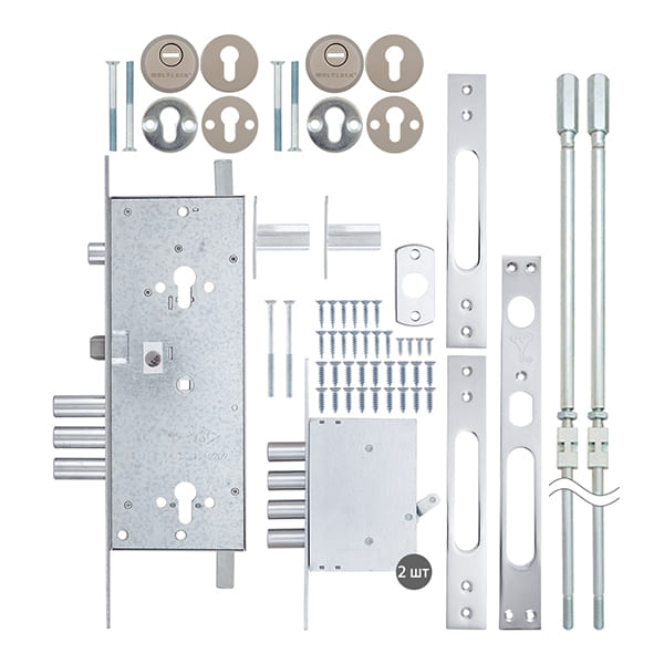 Механизм замка MUL-T-LOCK 415G двухсистемный (BS63 * 85мм) хром комплект + 2 протектора никель сатин