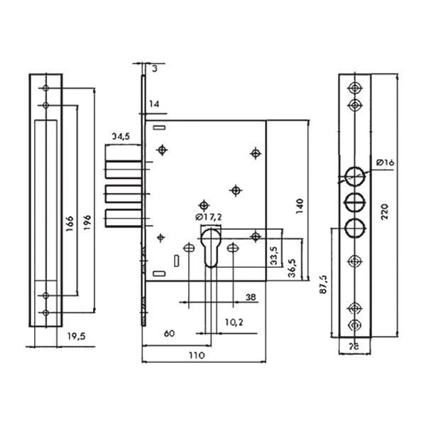 Полный выход ригелей диаметром 16 мм составляет 34,5 мм. Управление осуществляется сердцевиной стандарта EURO DIN. Она в комплект не входит и покупается отдельно в зависимости от ваших потребностей.