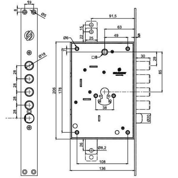Врезной замок итальянского производства SECUREMME 2603 представляет собой цилиндрический механизм, который устанавливают в входные дверные полотна из металла. Является основным замком, имеет защелку. Сердцевина стандарта EURO DIN выбирается отдельно в зависимости от потребностей защиты и толщины двери. Замок имеет специальное запатентованное крепление сердцевины, которое защищает ее от выбивания. Данный замок предназначен для установки в левосторонние двери загородных домов, квартир и коммерческих помещений.