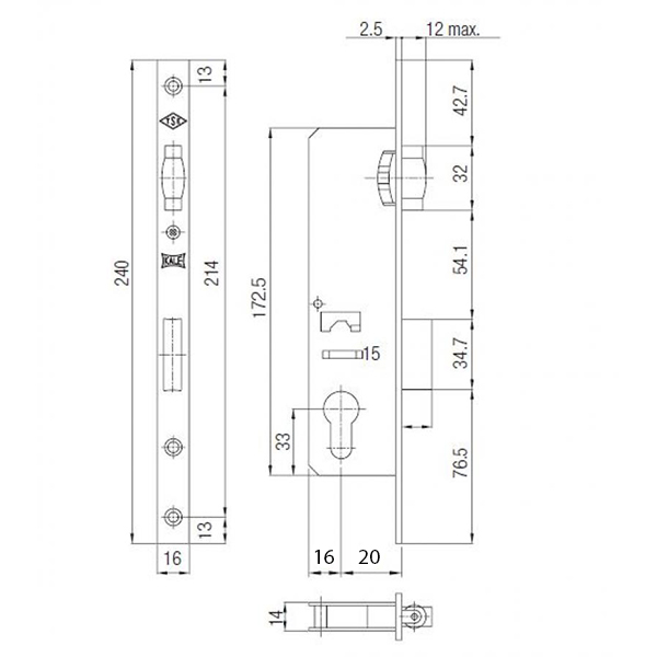 Описание Механизм замка KALE 155 P-20 (16 mm) (BS20мм) хром