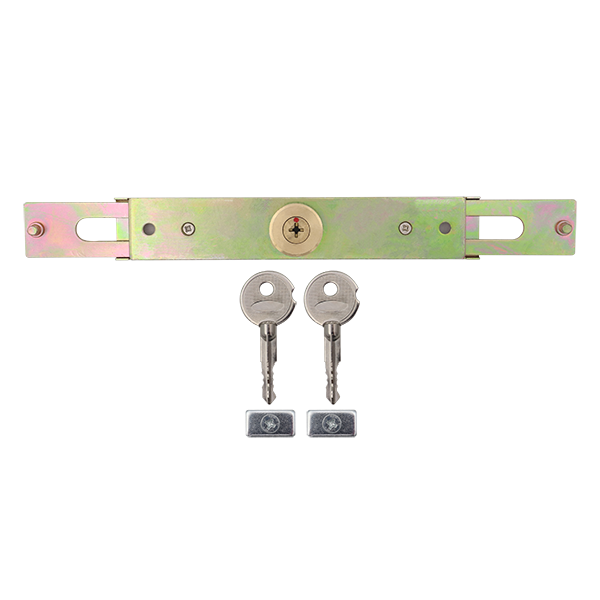Замок 30*205 мм используется исключительно в роллетах. При повороте ключа выдвигаются тяги управляющие ригелями. Монтируется в нижнюю планку роллета. Управляется крестовидной сердцевиной. Ключи в комплекте 2.