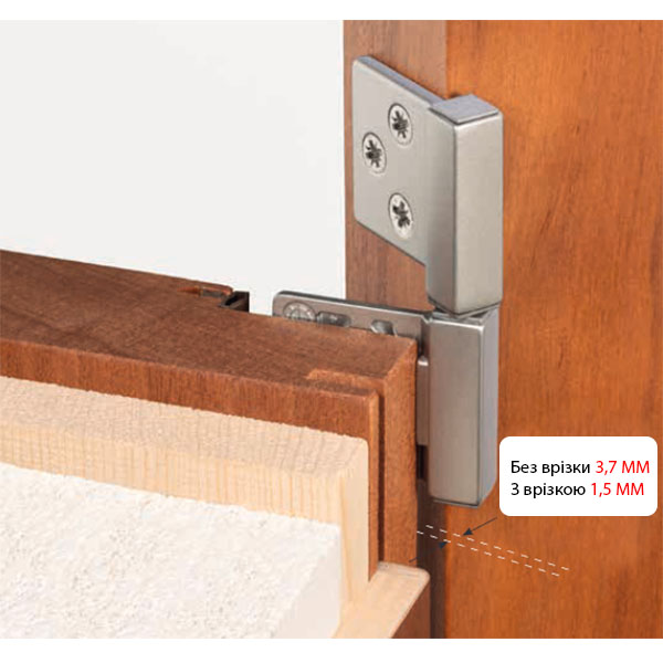 Петли монтируются быстро благодаря специальному стопперу к дверной раме путем наложения в отфрезерованный паз. В таком случае щель между дверью и коробкой будет составлять до 1,5 мм. Возможен монтаж простым наложением без паза. Тогда промежуток будет 3,7 мм. Фиксируется шурупами, идущими в комплекте.